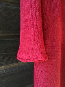 Den ser ut att vara cerise, men är bordeaux. Stickad i 100% lin. En helt underbar modell med V-ringad hals, klockad kjol i klassisk modell och lite utställda trekvartslånga ärmar. Precis rätt för kvinnan som äger den! Vad är det som gör en klänning precis rätt för dig?